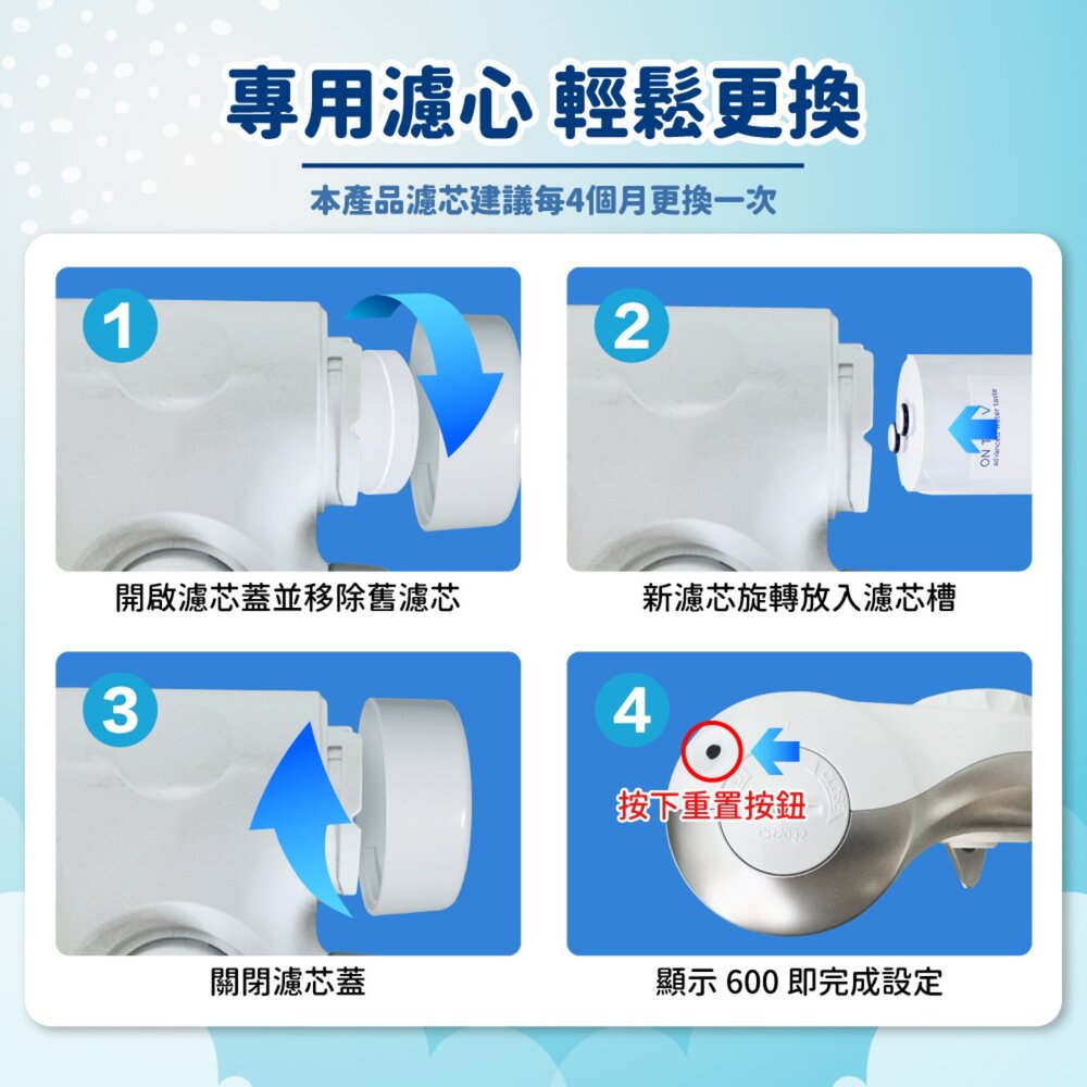 ▸ 濾芯可過濾600公升水量,為了確保最佳過濾效果,應於每過濾600公升水量或每4個月更換一次(各地水質不同,使用週期因地而異)