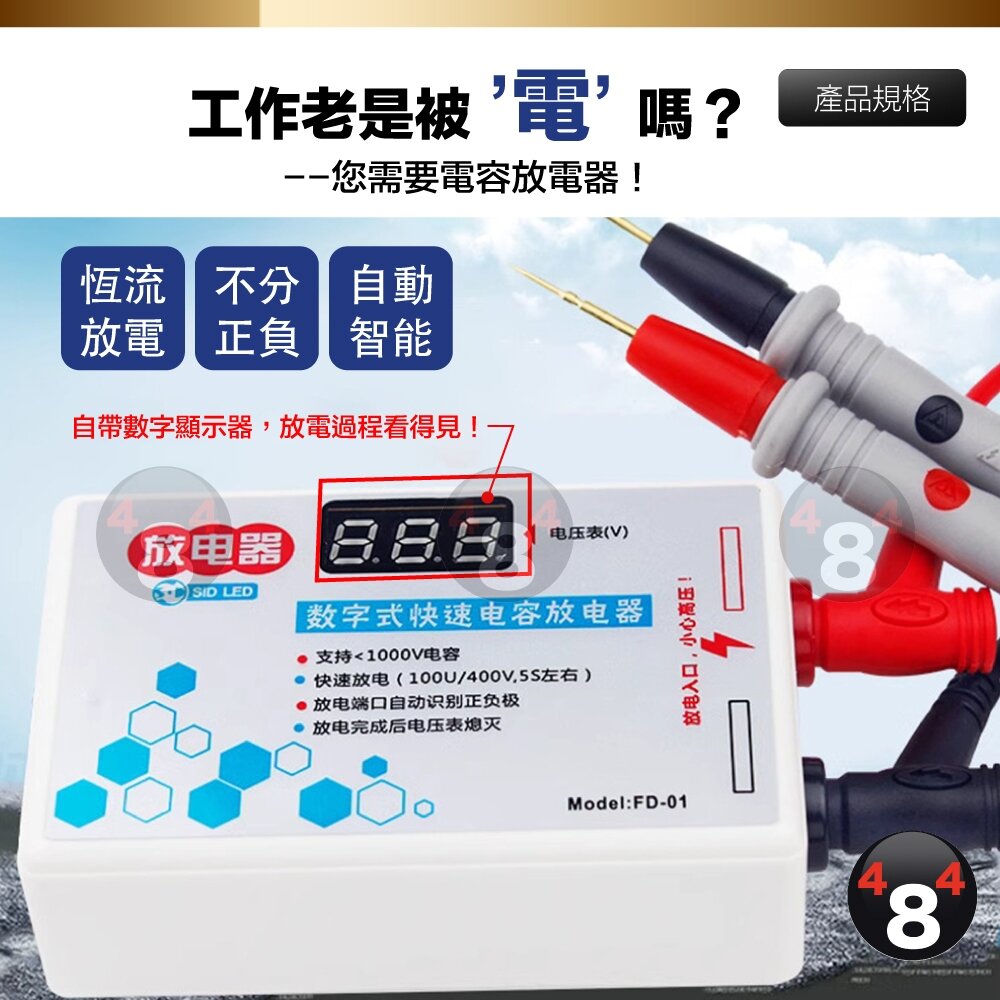 放電顯示:數位顯示監測放電電壓,當䆁放至安全電壓(約6V)電壓表熄滅,