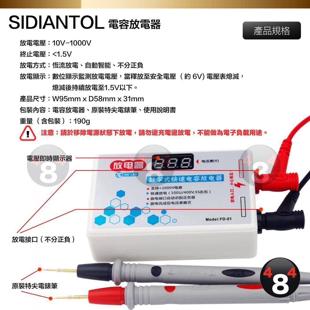 包裝內容:電容放電器、原裝特尖電錶筆、使用說明書