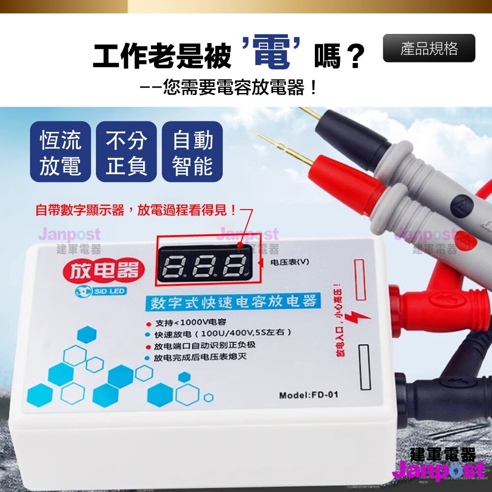 放電顯示:數位顯示監測放電電壓,當䆁放至安全電壓(約6V)電壓表熄滅,
