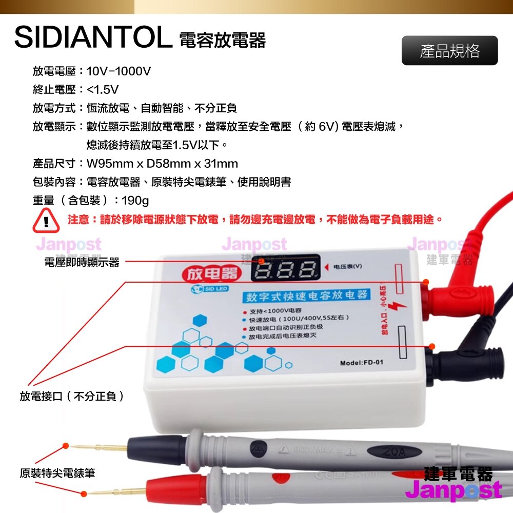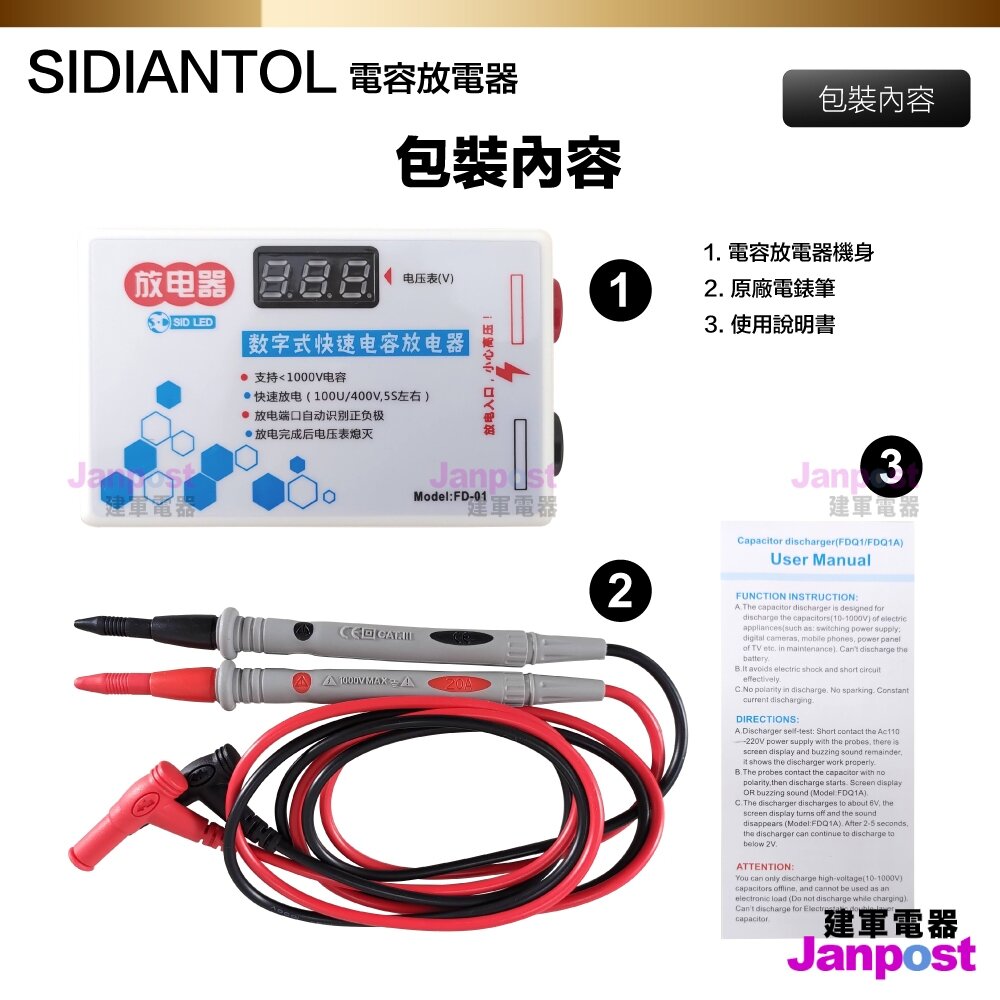 包裝內容:電容放電器、原裝特尖電錶筆、使用說明書