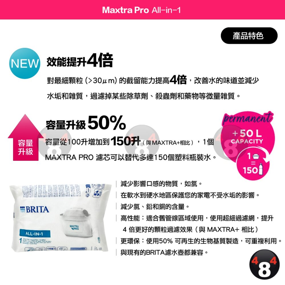 1個MAXTRA PRO 濾芯可以替代多達 150 個1L的塑料瓶裝水,提升50L過濾容量(與 MAXTRA+ 相比)