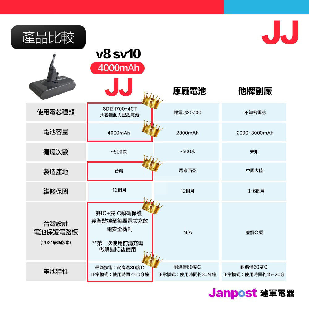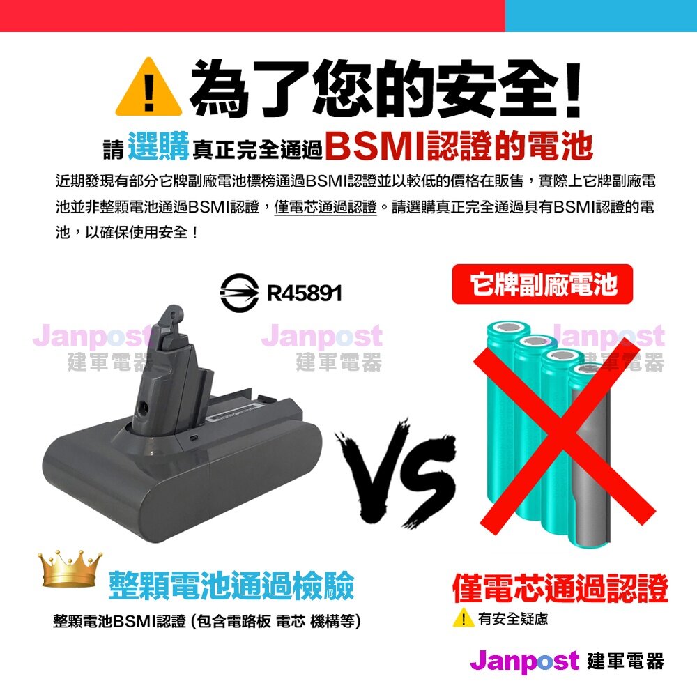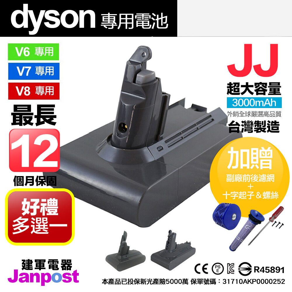 贈吸頭保固12個月 Dyson 戴森 JJ台製電池 V6 V7 V8 電池 高容量電池 高品質電池 BSMI認證
