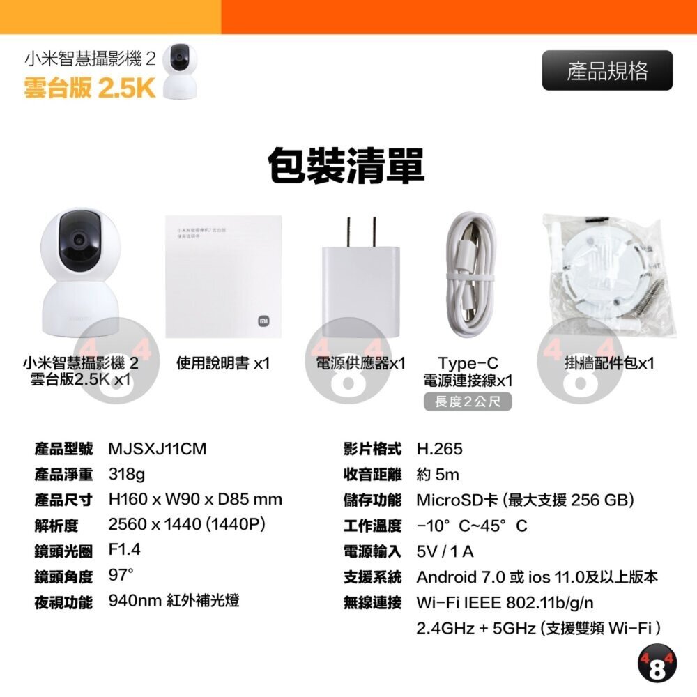 小米攝影機2 雲台版2.5K x 1、說明書 x 1、掛牆配件包 x 1、Type-C電源線 x 1、電源供應器 x 1