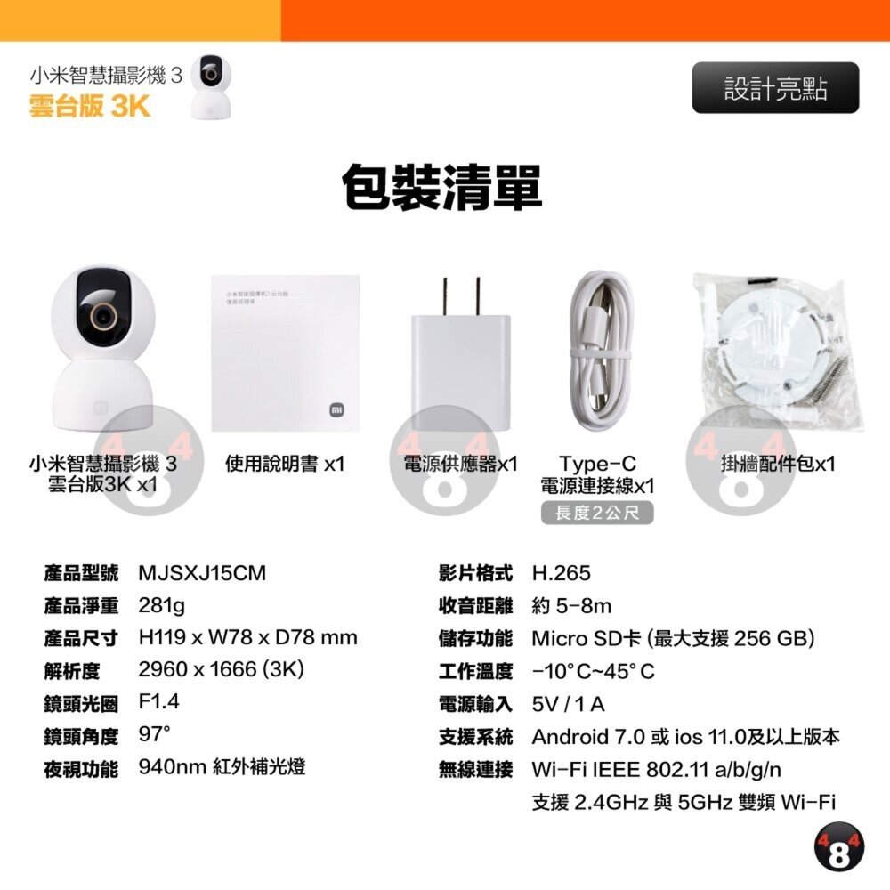 小米攝影機3 雲台版3K x 1、說明書 x 1、掛牆配件包 x 1、Type-C電源線 x 1、電源供應器 x 1