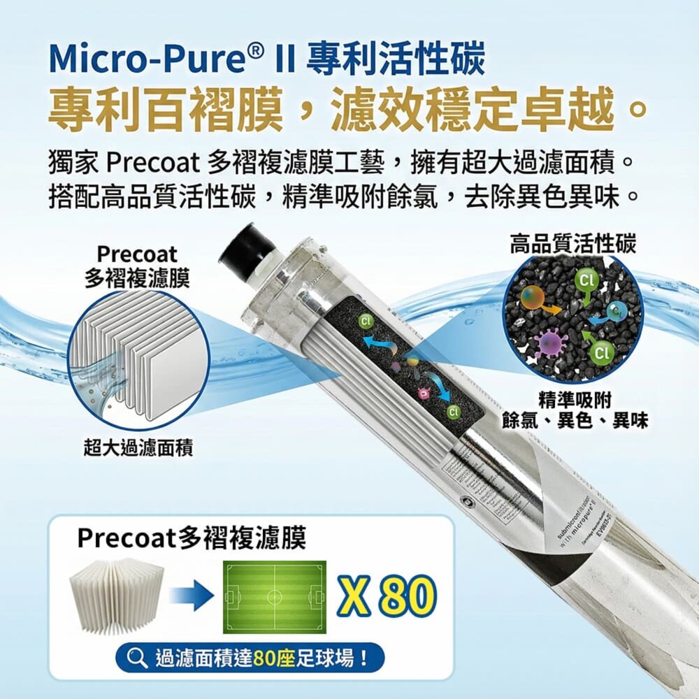 ‣《Precoat 多複褶濾膜功能》該功能為增加過濾面積,進一步強化過濾功效,去除水中餘氯、異味、沉積物、囊腫或孢子(如賈第鞭毛蟲、隱孢子蟲),並改善水質,特別適用於飲用水淨化。