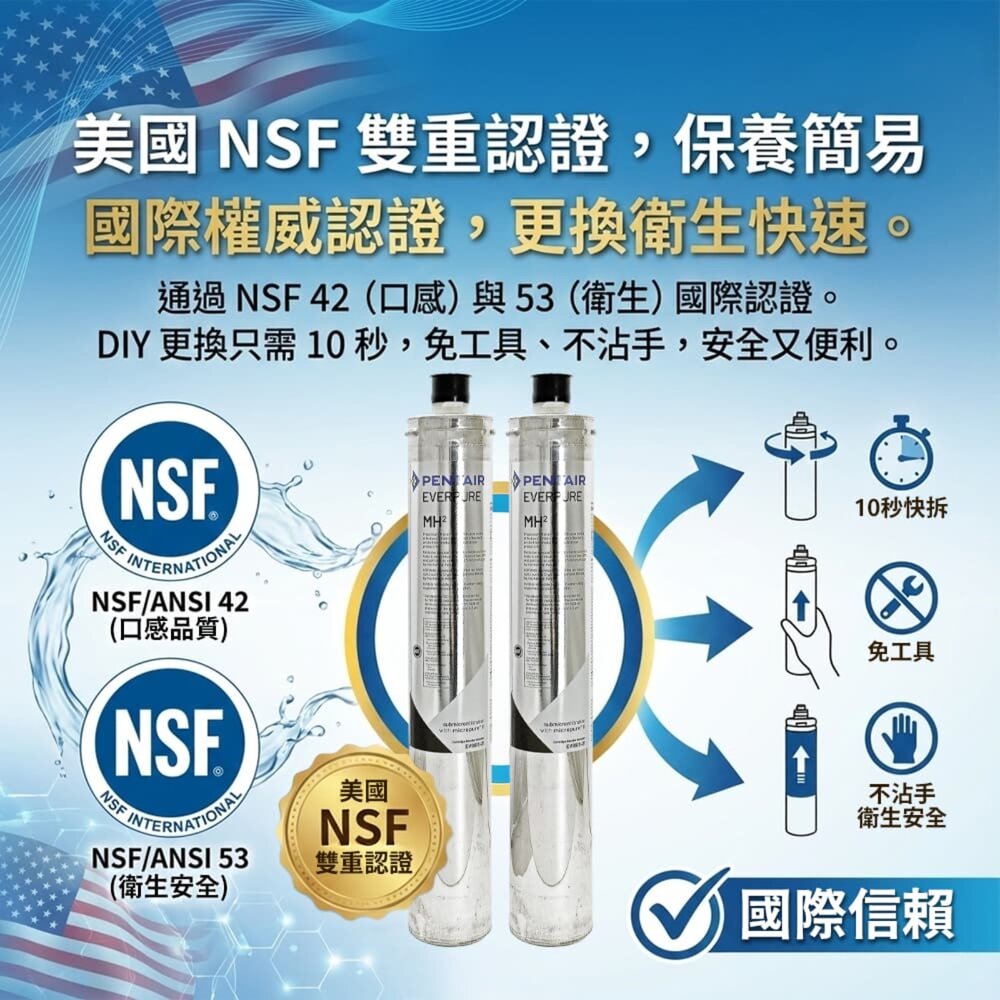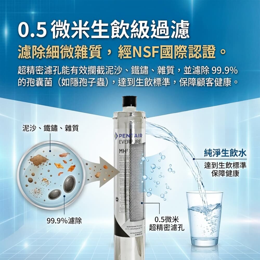 ‣《Micro-Pure 專利活性碳功能》 經 N.S.F. 國際標準認證評定為第一級的Everpure 專利活性碳,有效抑制水中殘留氯,異色異味等有害人體健康之細菌