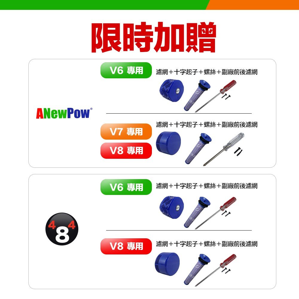 內容物:V6電池*1、副廠前置濾網*1+副廠後置濾網*1、十字螺絲起子*1+螺絲*2、中文說明書*1