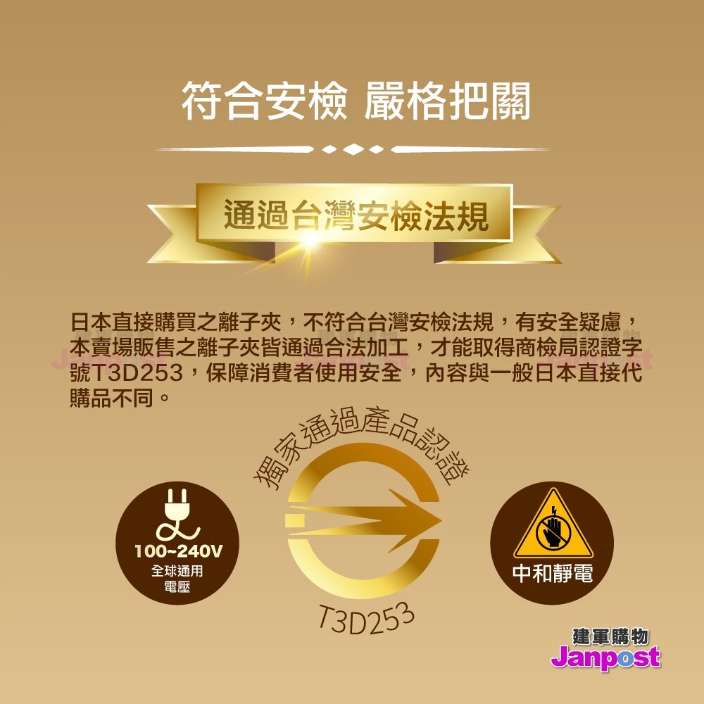 ❗️❗️❗️日本直接購買之離子夾,不符合台灣安檢法規,有安全疑慮。本賣場販售之離子夾皆通過合法加工,才能取得商檢局認證字號T3D253,保障消費者使用安全,內容與一般日本直接代購品不同。❗️❗️❗️