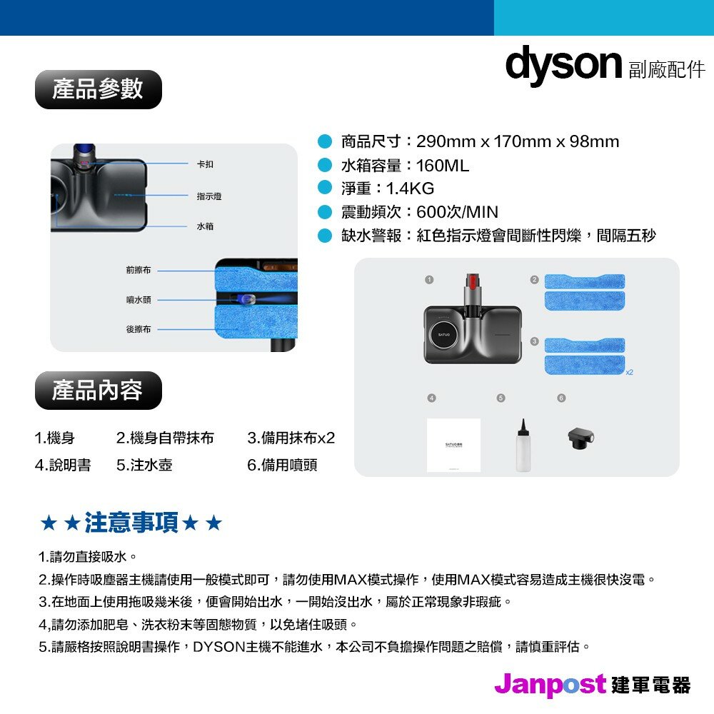 5.請嚴格按照說明書操作,DYSON主機不能進水,本公司不負擔操作問題之賠償,請慎重評估。